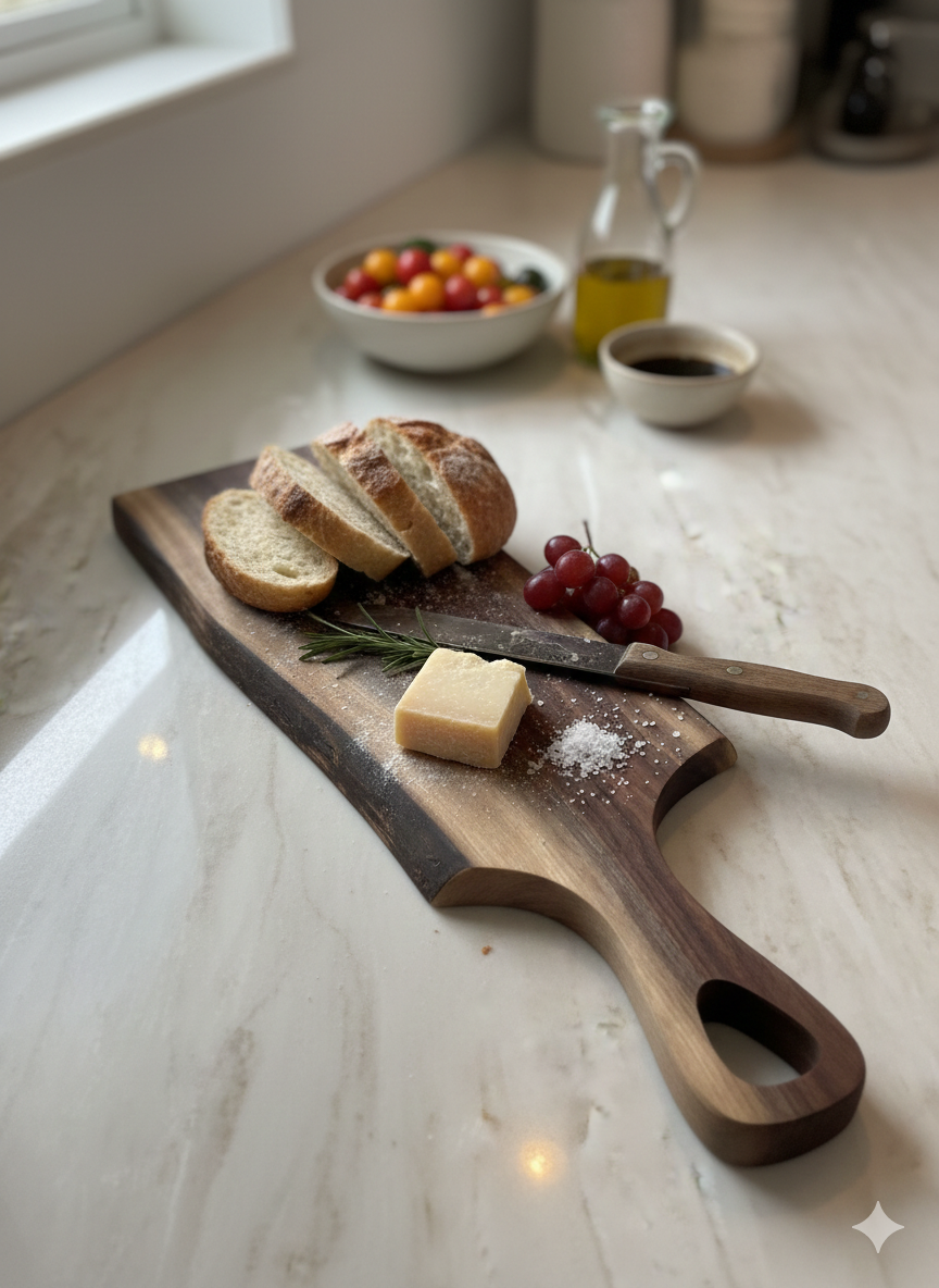 This board is very versatile- you can use it as a charcuterie board or a cutting board….or simply as a statement piece!! It’s the perfect size - 24 inches long x 6-9 inches wide with a very stylish handle. And….its solid walnut! Absolutely gorgeous!